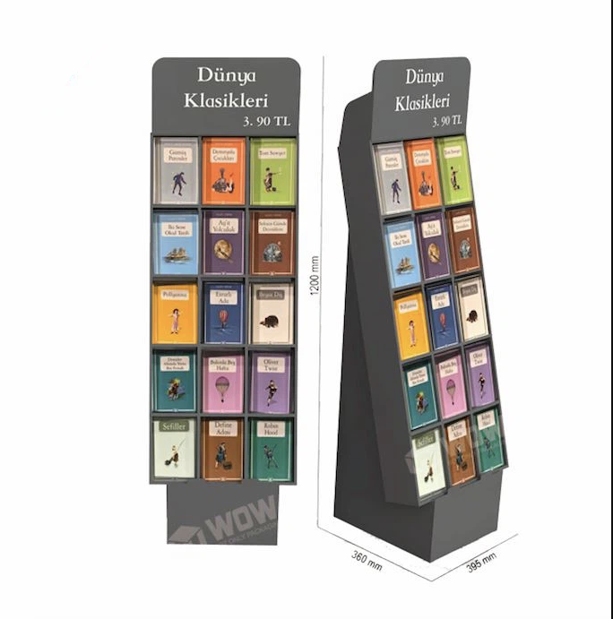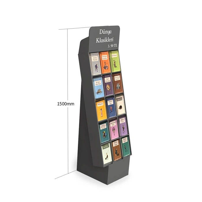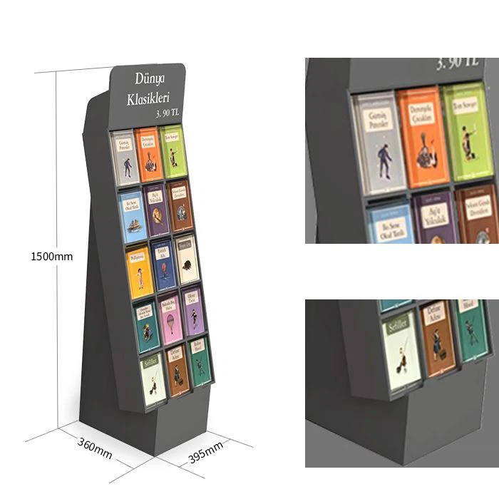 This cardboard book display stand is made out of 350g CCNB + B flute, 5mm thickness, with 4c CMYK offset printing and glossy laminated, whole double book display cardboard looks pretty shining. Besides, the cardboard book display stands is structured with small cases, each cases can be loaded different books/cards/poster etc. pretty convenient for different items displaying.