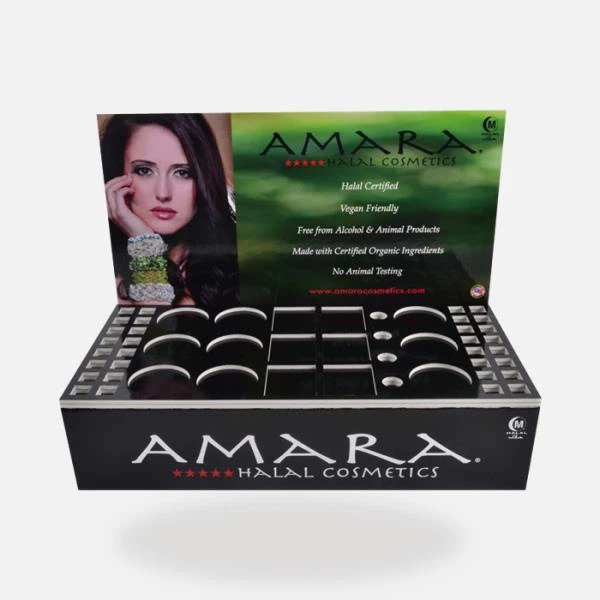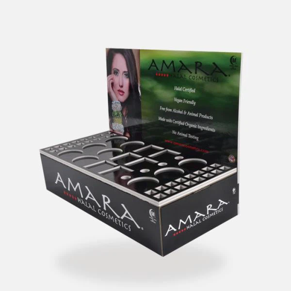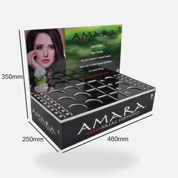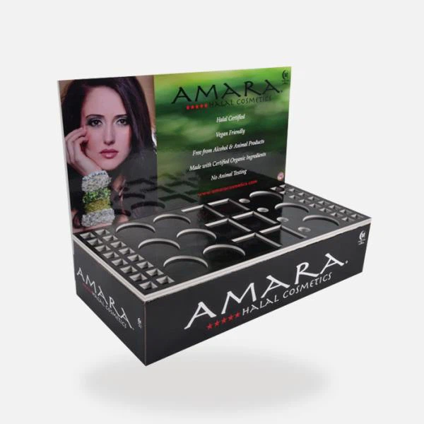 This sunglasses counter display is made out of graybeard and printed with full colors. Very easy of assembling, can display as many as sunglasses on a limited display space.